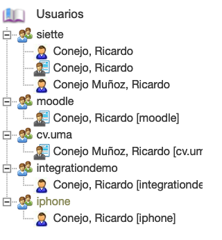 en donde los usuarios se agrupan por procedencia, y se muestra un icono diferente para profesores y alumnos.