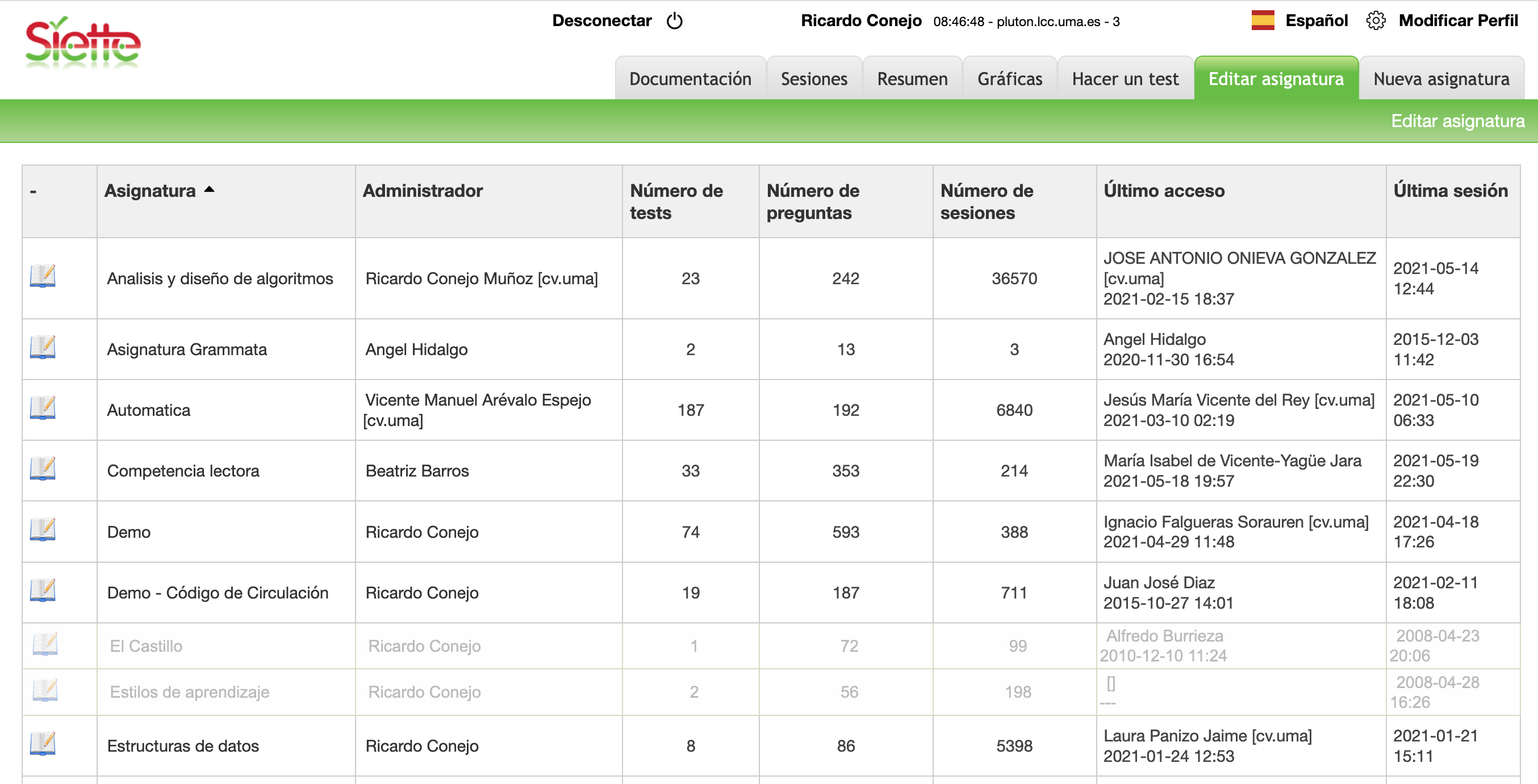 Pulsando sobre el nombre de la asignatura se accede al editor de asignaturas donde se pueden completar y modificar los datos de la asignatura, crear preguntas, definir las evaluaciones (test), crear grupos, etc.